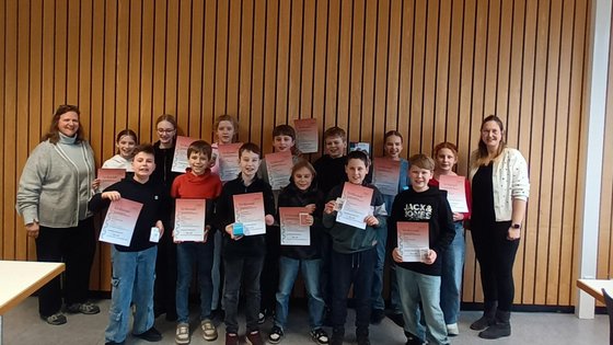 Bottrop, 10.02.2026: 6 Schülerinnen und Schüler der Jahrgangsstufe 8 vom Heinrich-Heine-Gymnasium überzeugten beim „Jugend präsentiert“-Schulwettbewerb mit ihren Präsentationen zu einem naturwissenschaftlich-mathematischen Thema die Jury und qualifizieren sich damit direkt für das Länderfinale des Bundeswettbewerbs „Jugend präsentiert“.