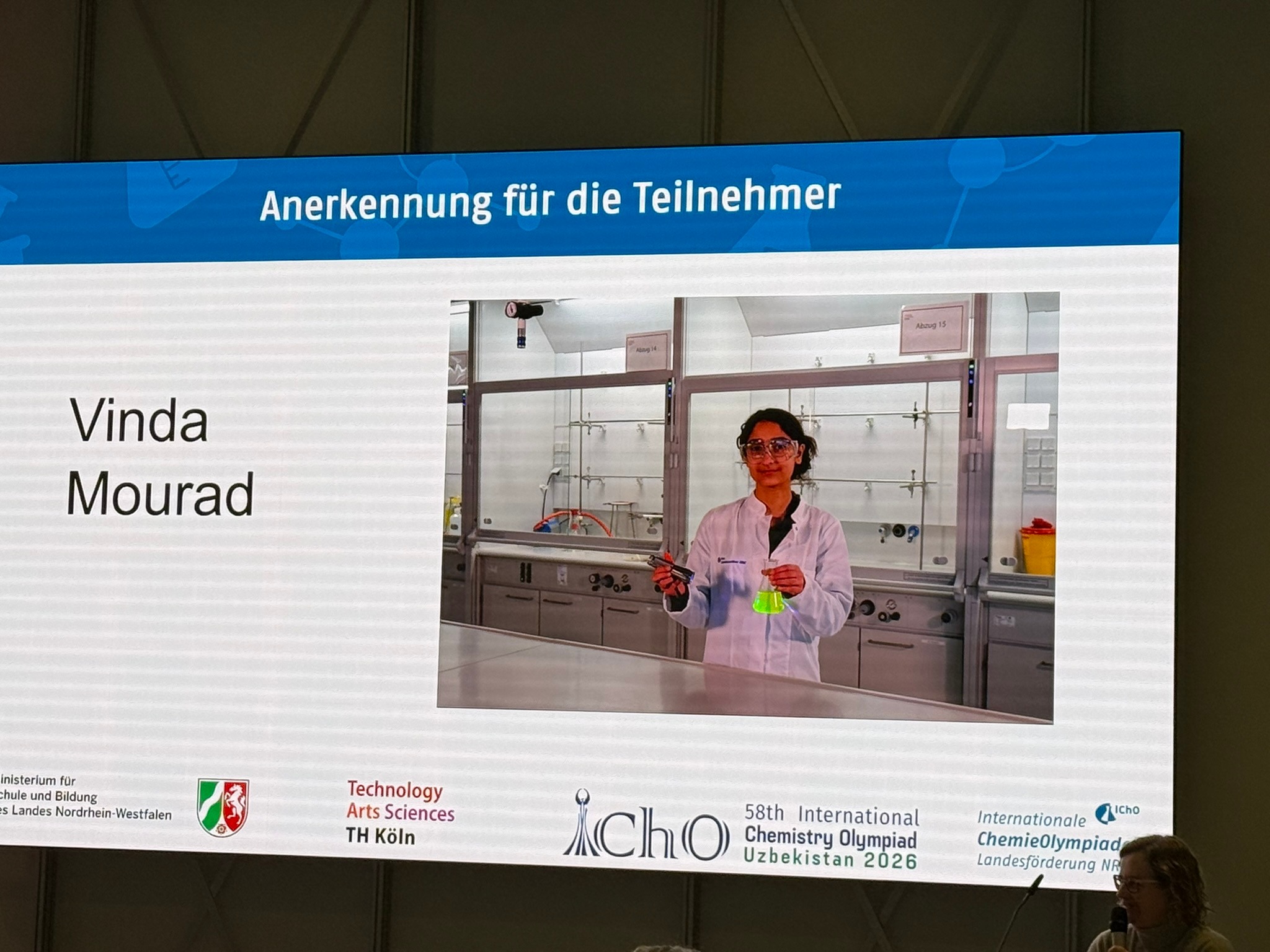 Für diesen besonderen Erfolg wurde Vinda im Rahmen einer Feierstunde geehrt. Schulministerin Dorothee Feller würdigte die Leistungen der ausgezeichneten Schülerinnen und Schüle persönlich – die Ehrung fand am 11.02.2026 an der TH Köln am Campus Leverkusen im Zusammenhang mit dem NRW-Landesseminar der IChO statt.