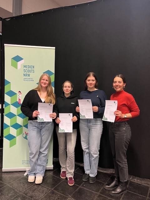 Gestern wurden die Zertifikate der Landesanstalt für Medien NRW an die Medienscouts Pia Schöffler, Paulina Roy und Greta Wilch aus den Jahrgängen 9 und 10 verliehen.